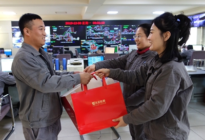 12月30日,河钢唐钢物流分公司工会人员正在调度室慰问患重病的行车调度员贾明群。