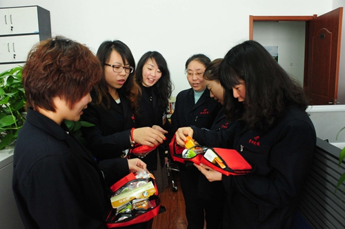 “三八妇女节”来临之际首钢建设集团工会为全集团女工每人发放了一份收纳着剪刀、温度计、化妆镜、烫伤膏、创可贴等美容保健用品的“女工健康包”图为女工姐妹们领到“女工健康包”时开心的情景。 首钢建设集团 赵泽民 摄影报道