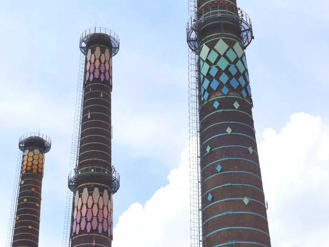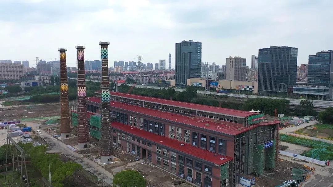 原本直挺挺的工业烟囱顿时变身为美轮美奂的艺术建筑!而这座初轧厂的厂房,也在参建人员的精心打造中将变为现代服务业的载体。