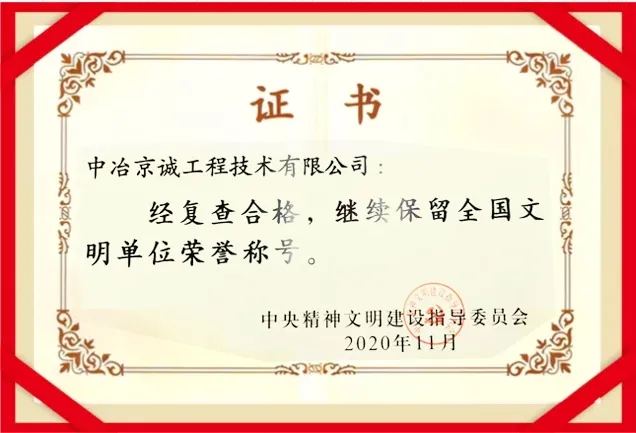 近日,中冶京诚顺利通过2020年全国文明单位复核,继续保留“全国文明单位”称号,这是中冶京诚自2011年被评为全国文明单位,十年来一直保持此项殊荣。同时,中冶京诚获评2018-2020年度“首都文明单位标兵”称号,这是中冶京诚自2003年以来连续获得这一殊荣。