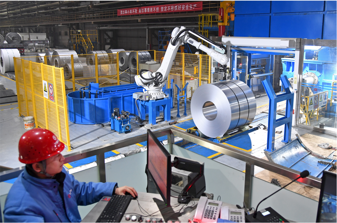12月14日,中国宝武太钢集团不锈冷轧厂智能拆捆机器人在进行生产作业。太钢以“四个一律”即:“操作室一律集中,运维一律远程、服务环节一律上线,操作岗位一律机器人”为目标,全力加强智能化建设,推进智慧钢铁进程,有效减轻了职工劳动强度,美化了工作环境,增强了安全保障,提高了工作效率。 太钢新闻中心 王旭宏 摄影报道