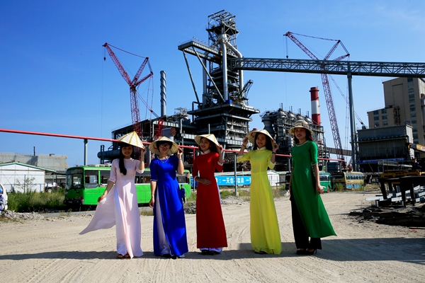 2015年,我们参建了越南和静钢铁厂,钢厂建在海边,拍摄条件还比较好,只是语言交流有问题,项目部全力配合拍摄工作特意配备了一个叫阿莲的翻译。当时工程已经交工,所有与甲方交涉都是阿莲帮助完成的,通过无人机对整个现场进行了大幅面拍摄,地面的基础房建则进行精准记录,还到达闲人免进的中央控制室对细节进行了刻画,阿莲说:帮助中国人是她最快乐的事情,中国人带来了技术,建成了这么大的高炉,我们村的男人都有了工作,她还说等项目结束也去中国学习。为表示对她工作的谢意,我准备给她们拍摄一组照片,她们很珍惜这次拍摄,特意叫上小伙伴穿上她们的国服一起来拍照,拍照的时候正是中午时分,为工地增添了一份异域风采。