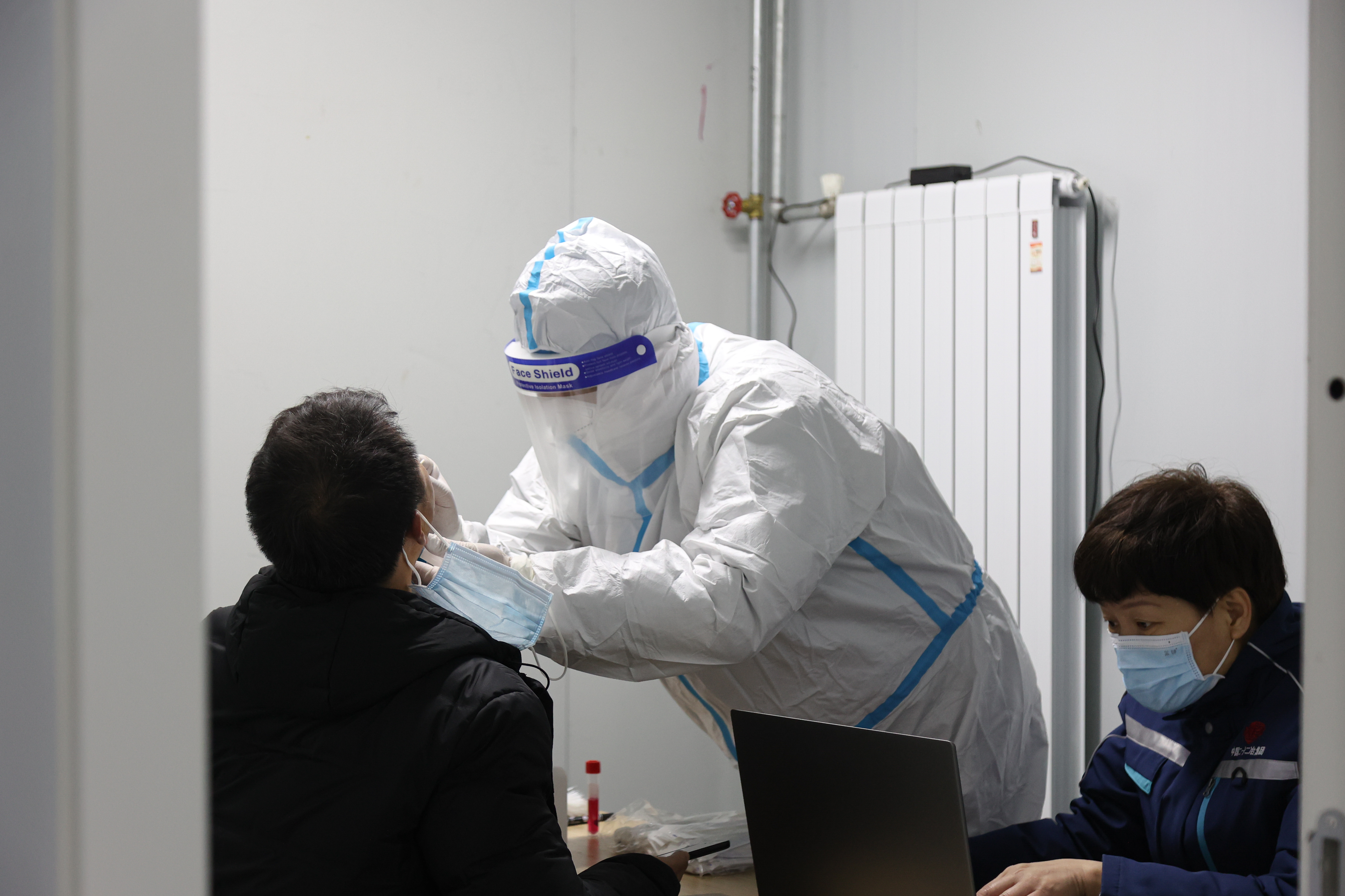 “请亮腾讯健康码。”“来,张嘴,啊——”外科大夫陈春宇和王利娟,一人扫码、一人做咽拭子,配合得非常默契。为了保障整个工地的所有工作人员的生命健康,也为了加速整个工地的运转速度和工作效率,二十二冶医院特派了两名党员在抢建期间常驻。工人两班倒,昼夜不停工,两位大夫就跟着白天夜里的连轴转,每日一次全员核酸要确保不落一人,他们独创了‘一眼识别核酸否’的标记标识,因此被大家戏封为“门岗总捅”,隔离服中的他们,起初的汗水又慢慢结为冰渣。问及是否挂念家中上网课的孩子,陈春宇意味深长地说:“每个人心中,都有他想守护的人;但是目前的唐山,同样需要守护他的人!”