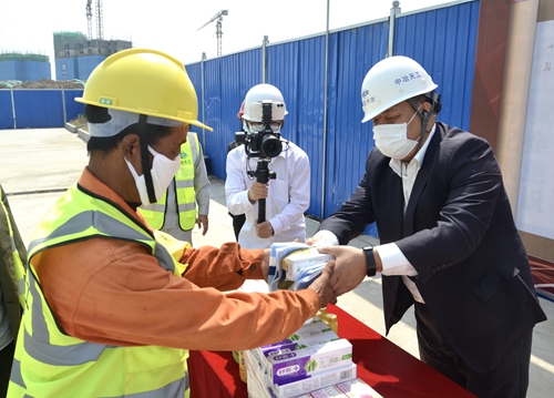 活动最后,公司领导慰问了项目农民工代表,为他们发放口罩、绿豆、冰糖、菊花茶等防疫和生活物品,并通过农民工代表向项目广大参战员工表示节日的慰问。同时,鼓励大家努力克服疫情带来的不利影响,继续“撸起袖子加油干”,抢抓施工黄金期,咬定“战疫情、稳增长、强信心、破困境”目标不放松,为确保全面完成上半年施工任务,奋力打好“大干快上”攻坚战。