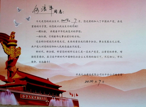 “小何,今天是你的政治生日,六年前的今天你光荣的加入了中国共产党,在这重要的日子里,向你致以政治生日的问候!”7月1日早上刚上班,九冶汉中公司党群工作部副主任徐鹏就为小何送去了一份特殊的生日礼物。