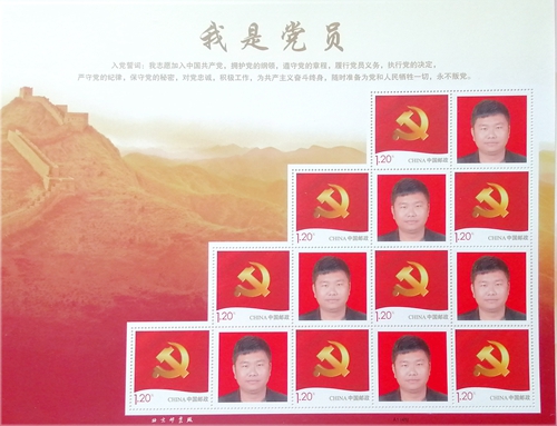 这是九冶汉中公司为党员订制的政治生日邮票贺卡,贺卡封面由党徽、华表和“永远跟党走”五个大字组成,扉页上印制了党员的入党时间,以及公司党委对党员政治生日的祝福。贺卡内嵌一套由党员个人照片和党徽为图案的邮票。