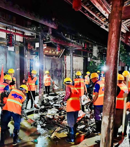 受洪水淹没后的黄龙溪古镇,满目疮痍、一片狼藉。位于府河岸边的街道、商户内更是淤泥盖腿、残物横陈。抢险突击队队员们手握铁铲,全力清理堆积的泥沙、杂物,不顾脏污,打捞各类垃圾、枯枝,确保道路排水通畅,帮助受灾群众重整家园。