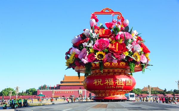9月12日上午,首钢建设集团钢构公司将制作好的花坛构件装车,从距离天安门现场300公里外的河北唐山乐亭加工基地出发,当天晚上到达通州西集暂存两天,9月14日晚运输至天安门安装现场组装;于9月16日凌晨两点交付北京市花木公司进行插花。