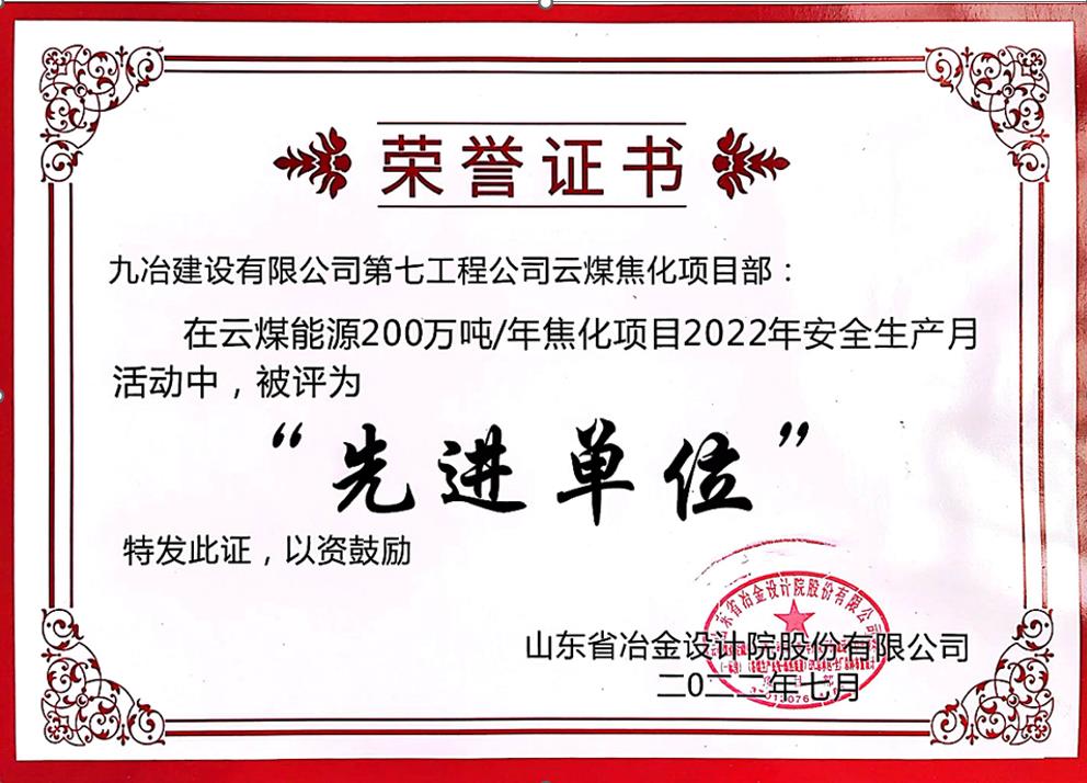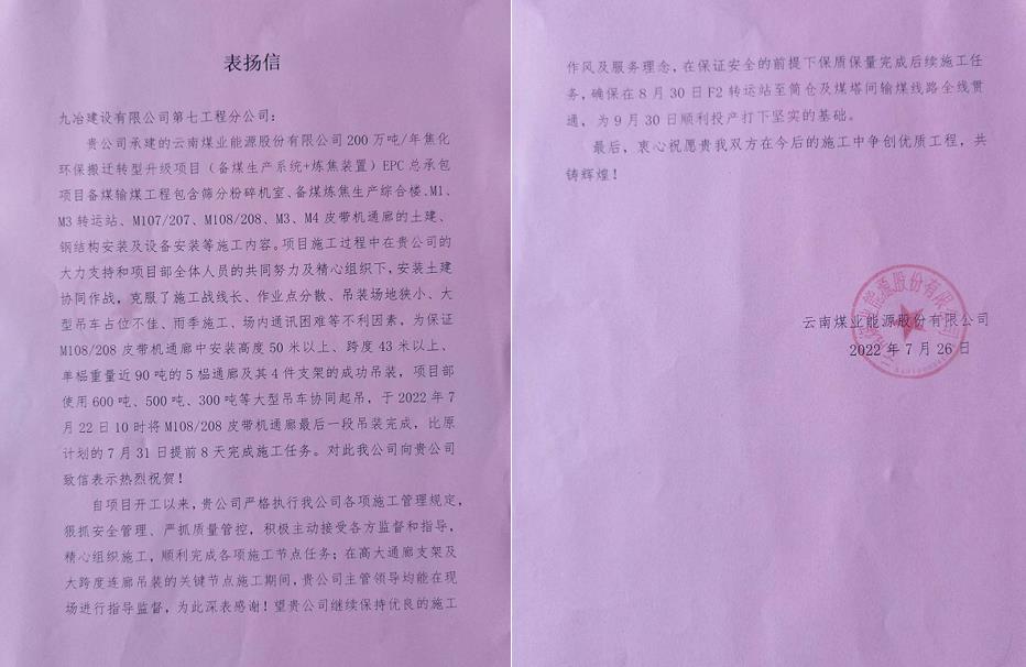 7月26日,九冶七公司收到云南煤业能源股份有限公司发来的表扬信,业主对九冶七公司云煤焦化备煤项目提前8天完成M108/208 皮带机通廊吊装节点给予高度肯定和表扬。同日,九冶七公司收到山东省冶金设计研究院股份有限公司颁发的荣誉证书,甲方表彰九冶七公司项目部在云煤能源200万吨/年焦化项目2022年安全生产月活动中荣获“先进单位”。