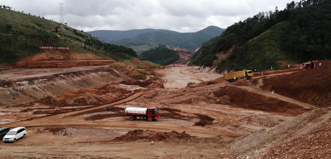 经过另一条刚建成的施工便道,来到回填和弃土场占地刚刚征用的瓦窑箐大桥处V形沟,一卷卷土工布已运抵现场,两三台铲车正在沟底施工排水盲沟。