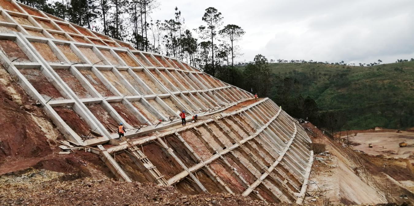 经过几个台阶式的作业面,到了边坡防护施工附近。这里的防护的拱形格,也有方形格的,正在做第4级防护,一级约有10米高16米长。坡顶,几个人配合将模板向下滑,坡中部几个人绑扎钢筋,附件几个人扛着纺织袋运送材料,底下混凝土泵车正在浇筑。边坡防护要经过放线、开槽、钻孔、安锚索(杆)、注浆、绑扎钢筋、支模、浇筑、锚索张拉、封锚等多道工序,由于坡体陡峭,无法动用机械设备,几乎全靠人工操作。