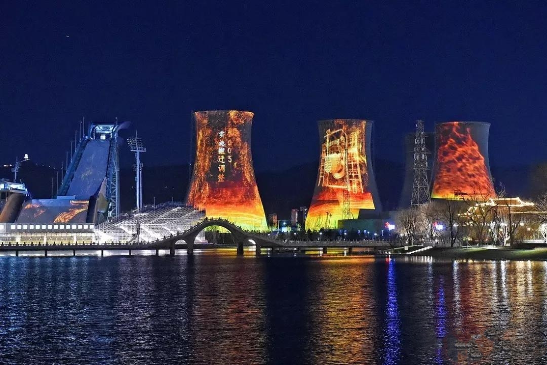 冰雪奥运与丝路飞天场景的动感画面打在了冷却塔群上,立体视觉效果分外震撼。