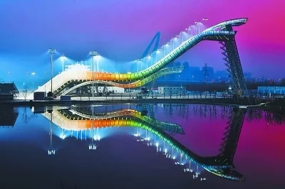 走进首钢园区,这里的夜别有一番风味:石景山和群明湖交相辉映,四座高耸的冷却塔巍然矗立,别具一格的工业风景象前,就是灯光笼罩的首钢滑雪大跳台。从远处看,大跳台好似一条飞天的飘带,又像一只晶莹剔透的水晶鞋。