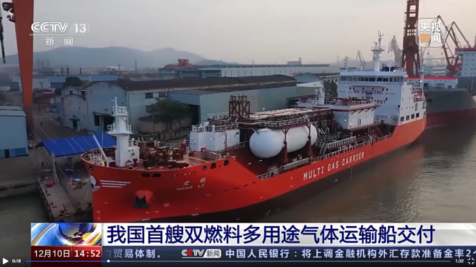 12月10日,中国一冶参建的广州文冲船厂9500立方LNG双燃料多用途运输船交付使用,央视《新闻直播间》对该船情况进行了详细报道。