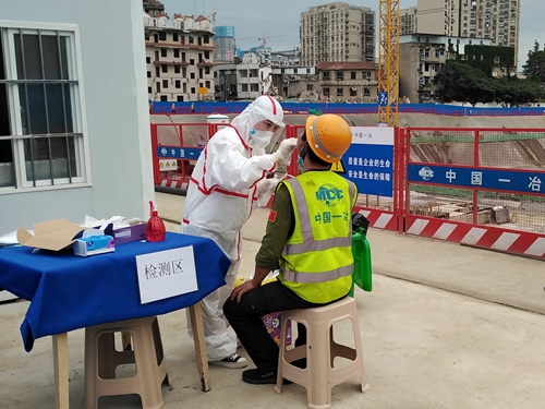 5月21日上午,中国一冶汉阳项目部邀请武汉市汉阳区疾控中心专业检测人员到项目施工现场为全体作业人员再次进行核酸检测,为施工生产再加一把安全锁。