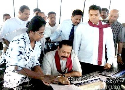 10月19日下午5时许,斯里兰卡总统马欣达•拉贾帕克萨(图中)莅临中冶天工集团上海公司承建的斯里兰卡汉班托特国际机场施工现场,在民用航空部部长Piyankara Jayaratne、国会参议员拉克莎曼•纳莫、斯里兰卡航空航天服务有限公司(机场业主)主席Prasanna Wickramasuriya等人的陪同下,先后视察了机场跑道、停机坪、航站楼以及航空控制塔。
