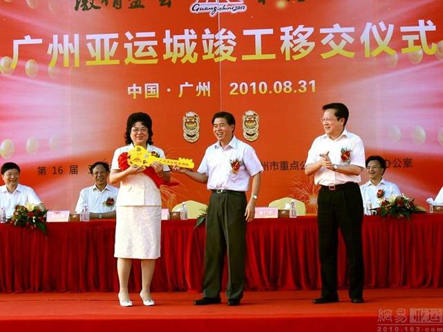 移交仪式上,广州市委书记、广州亚组委副主席兼秘书长张广宁将“亚运城金钥匙”移交给了广东省委副书记、省长、广州亚组委执行主席黄华华。接着,黄华华移交“亚运城金钥匙”给广州市委常委、市委统战部部长、运动员村团队主任、亚运城赛区领导小组组长孔少琼。随后,黄华华、张广宁等共同开启了广州亚运城的象征性城门,标志着广州亚运城正式展露在世人面前。