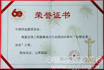 中国冶金建设协会荣获全国工程勘察设计行业国庆60周年业绩显著协会大奖