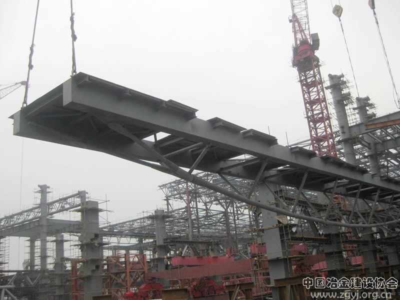 京沪高铁上海虹桥站共有四座人行天桥,宝冶钢构承建西面的两座。人行天桥单跨长49米、宽4米,重70吨,桥体本身高3.5米,桥体上方铺设花纹钢板;桥面下方架设一根长为54米、直径250mm、重21吨的实心圆钢拉杆,分成3段运到工地,进行现场对接拼装、焊接。