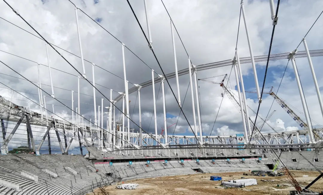 三亚体育场总建筑面积8.8万余平米,体育场屋盖为轮辐式索桁架结构,平面投影短轴224米、长轴261.8米,中心开口短轴134米,长轴171.8米。为提升结构抗风能力,屋盖结构布置内环交叉索;为降低内环交叉索对锁夹造成的不平衡力,该项目创新应用了强模比远高于普通钢索的CFRP平行板索,以新材料、新构件完美解决了结构问题。