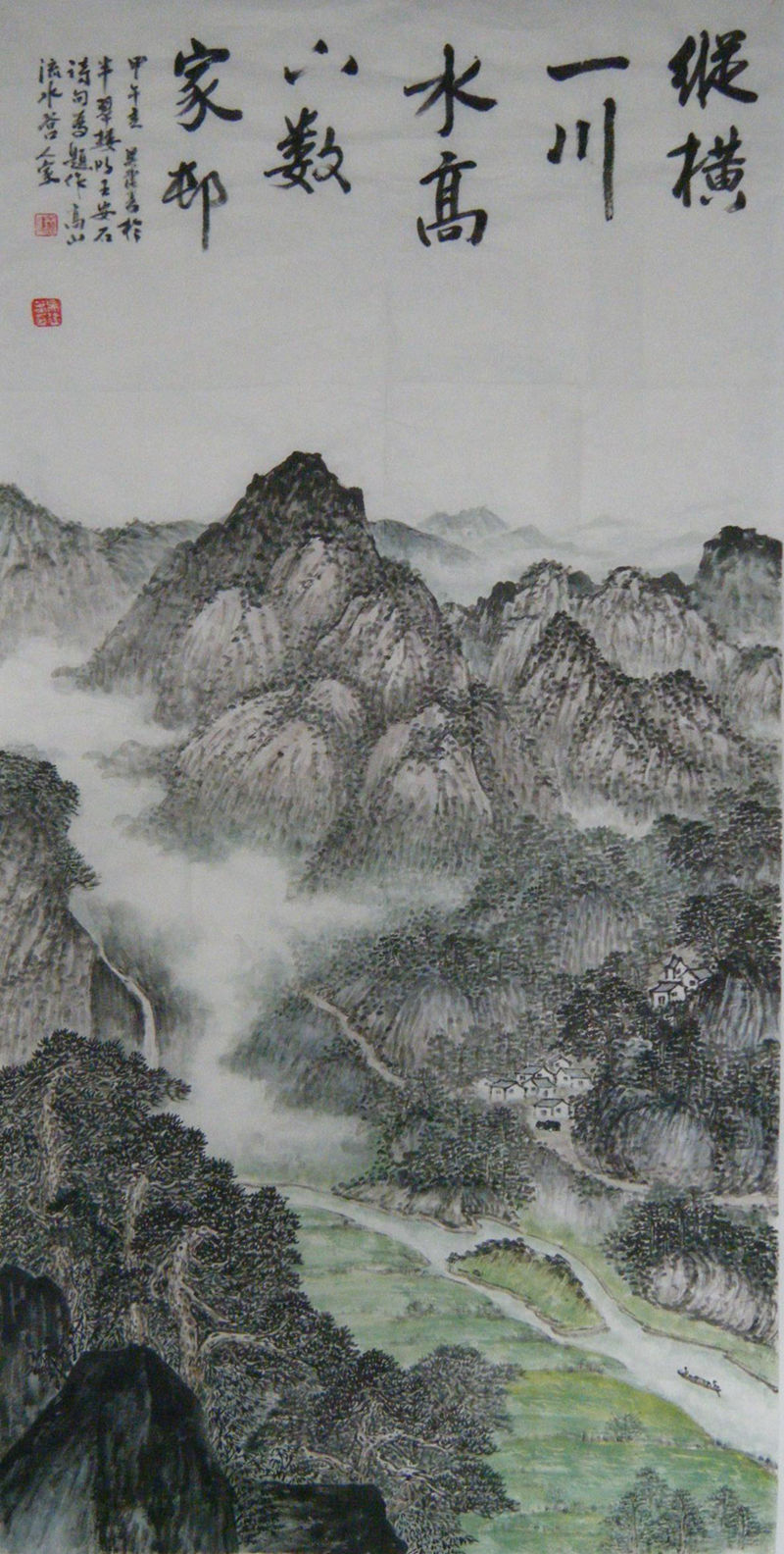 吴建春本次送展的作品包括荣获《中国冶金》举办的“钢铁情.中国梦”的优秀奖作品“丛横一川水,高下数家村”等五幅近年来创作的精品。他的山水画形象组织严密,局部内容充实耐人寻味。客观地把握和描绘大自然的高度技巧,把山水画绘成人间美镜,有东南之山多奇秀,与西北之山多浑厚的结合,而出奇秀与浑厚的风格融为一体,整体雄阔粗犷厚实,局部则潇散,细密金润,严谨精巧,简繁互用,密处不透风,疏处可行马。对比之法运用恰当,黑者更黑,白者自然透亮,尤以烟雾处理手法为甚,似有向上滚动之势,画面焕然一新。画上题有王安石诗句“丛横一川水,高下数家村”十个大字,书法浑厚,用笔凝重却也不乏活泼。 (中冶宝钢技术 方 刚)