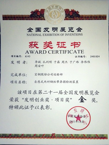 11月9日获悉,在第二十一届全国发明展览会上,中冶宝钢技术员工李伟伟、周安叶和宝钢员工共同研发的《自感式内衬钢丝带异损检测装置》,荣获“发明创业奖·项目奖”金奖。同时送选的《一种船舱矿湿料吸水装置及使用方法》等项目,分获三个银奖、一个铜奖。
