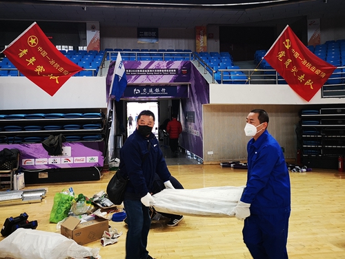 中国一冶党员突击队在武汉洪山体育馆内进行搬运物资。 中国一冶集团 供稿