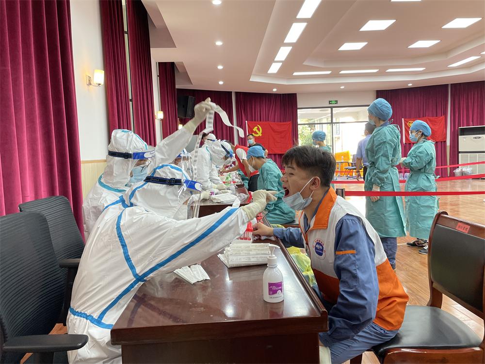 7月21日,中冶宝钢南京基地组织少数尚未接种疫苗人员前往医院接种疫苗,同时补充防疫物资,并在所有区域落实岗前和岗中测温及消毒工作,协调现场作业人员,保障生产平稳顺行。当天晚上,根据南京市政府统一部署,全市全员第一轮核酸检验工作在各社区同步进行,中冶宝钢南京基地连夜组织人员到所在社区接受核酸检测。