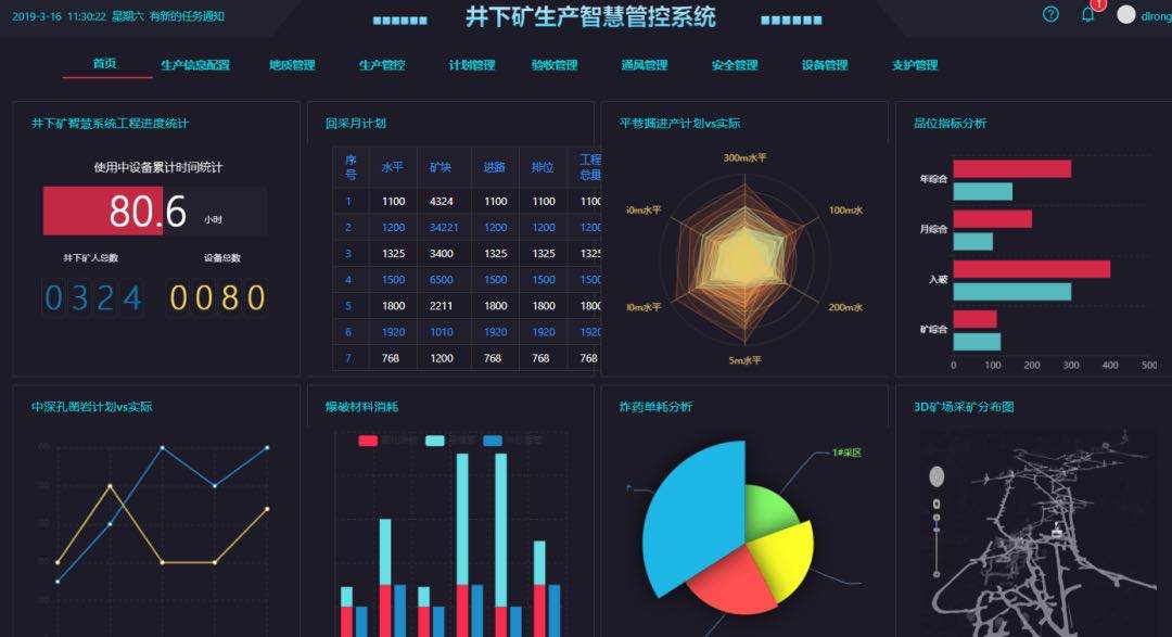 “井下矿生产智慧管控系统”是国内首个涵盖井下矿开采全业务流程的智慧管控系统,涵盖了井下矿开采从计划编制、过程管控,到验收、绩效反馈的全业务流程管控,为井下矿生产搭建了一条一体化联动生产管理路径,实现从生产管理层到生产执行层自上而下的精准指令下达以及从生产执行层到经营管理层的精确绩效反馈。
