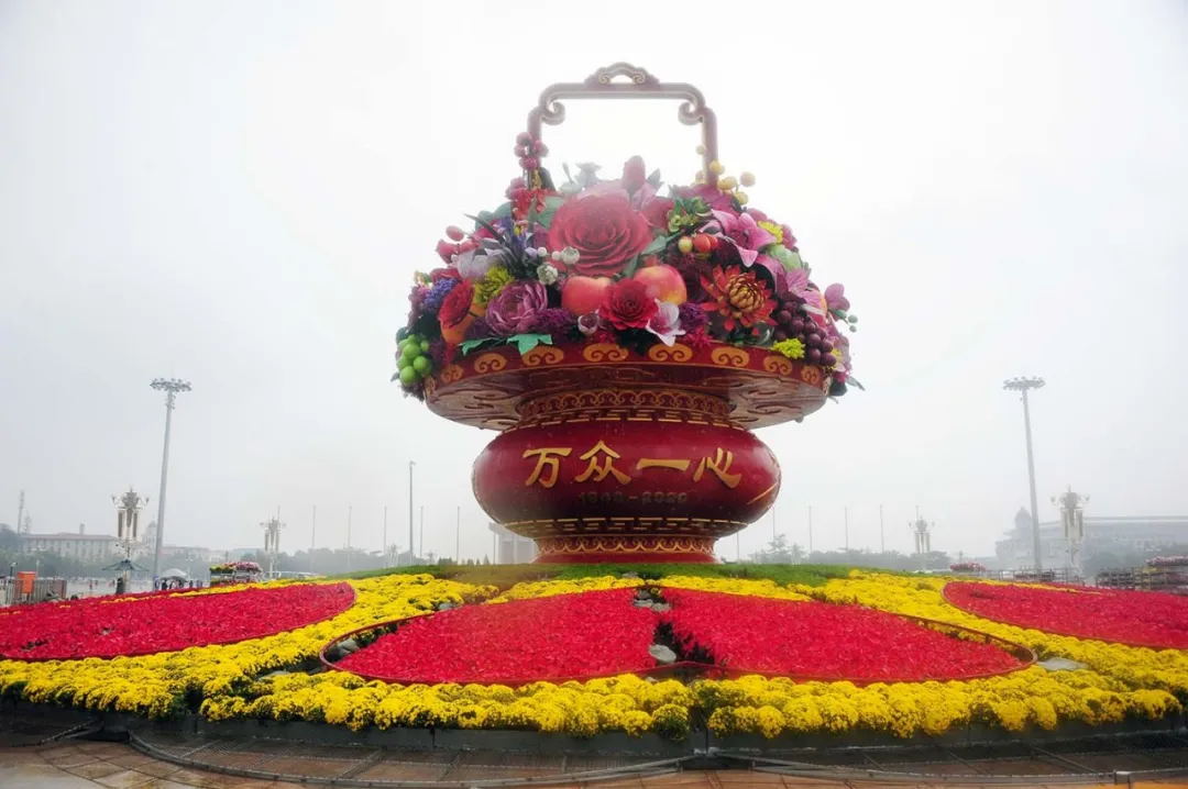 23日早晨,2020年国庆天安门广场主题花篮,在濛濛秋雨中亮相。这是首钢建设集团钢构分公司连续十三年承担国庆天安门主题景观花坛的制作安装任务。