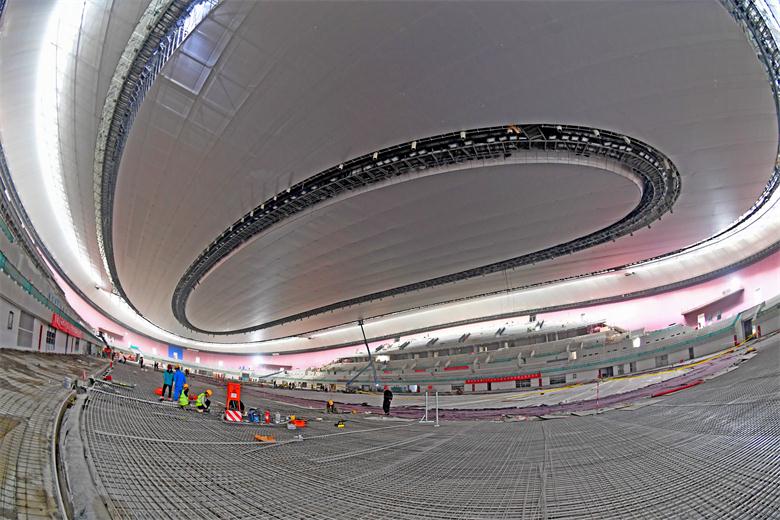 10月15日,建设者们正在北京冬奥会标志性场馆——国家速滑馆内铺设太钢不锈钢螺纹钢筋。
