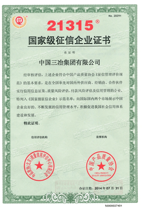 3月1日,中国三冶集团获得由中国产品质量协会颁发的国家级征信企业证书,这是中国三冶集团自2011年起连续六年获得此项荣誉称号。