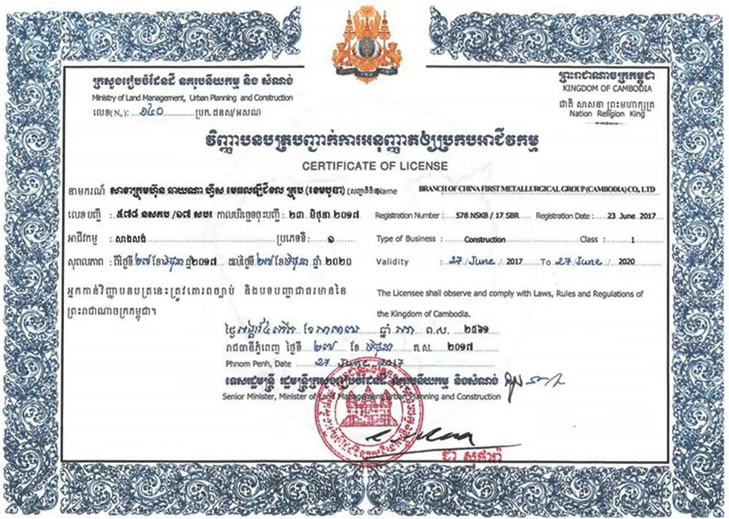 中国一冶海外柬埔寨分公司在柬埔寨获建筑、道路施工双“壹级资质”