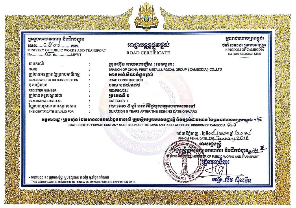 近日,获得了道路施工“壹级资质”,这是继该分公司在2017年在柬埔寨获得建筑施工“壹级资质”后的又一资质。