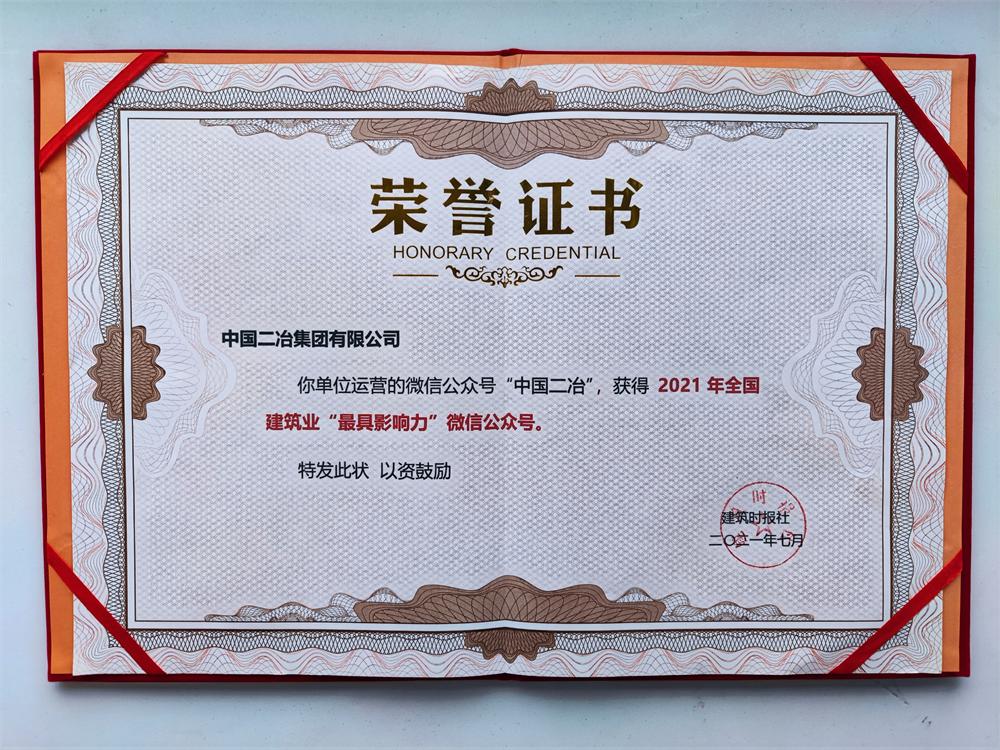 中国二冶微信公众号荣获“2021年全国建筑业最具影响力公众号”荣誉称号