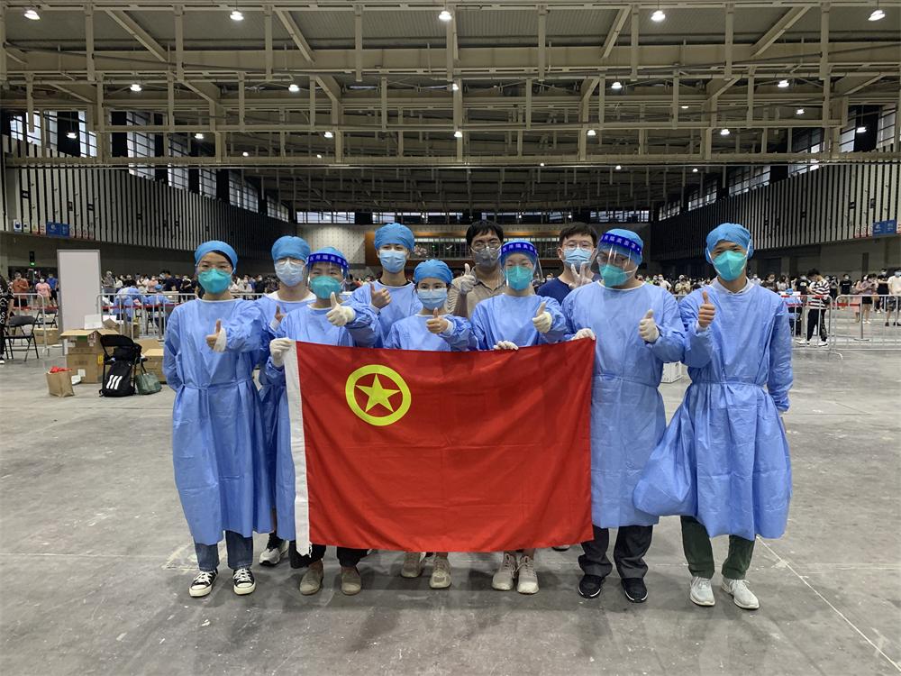 7月24日,又有11名青年志愿者奔赴南京国际博览中心,这是南京禄口机场经停人员(黄码)专门检测点,协助核酸检测工作。这些志愿者们按照核酸检测工作流程,引导群众扫码、维护排队秩序、登记人员身份信息,及时解答被检测人员的疑问,做好后勤保障工作,保障核酸检测工作顺利开展。面对一眼望不到头的队伍,以及焦急等待的人们,志愿者们抱着“多工作一分钟,多保护一个人”的信念,埋头苦干,午餐都轮换着就近寻找空地快速解决,之后又继续投入工作。他们身着隔离服和防护口罩,连续高强度服务长达11个小时。