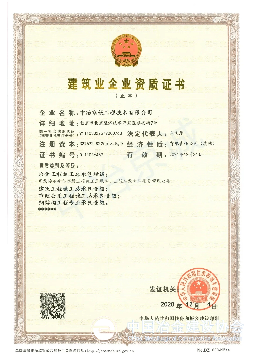 12月4日,住建部发布《关于核准2020年度第九批建设工程企业资质名单的公告》,中冶京诚成功取得“冶金工程施工总承包特级资质”,成为国内首家同时拥有“工程咨询资信综合甲级”、“工程设计综合甲级”、“工程监理综合甲级”和“施工总承包特级”资质的工程技术企业。