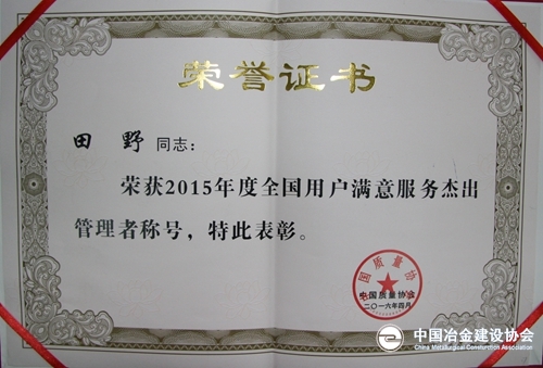 4月26日,2015年度创建“全国用户满意服务之星”推进大会在北京中国科技会堂召开,中国十九冶集团董事长田野获“全国用户满意服务杰出管理者”荣誉称号。