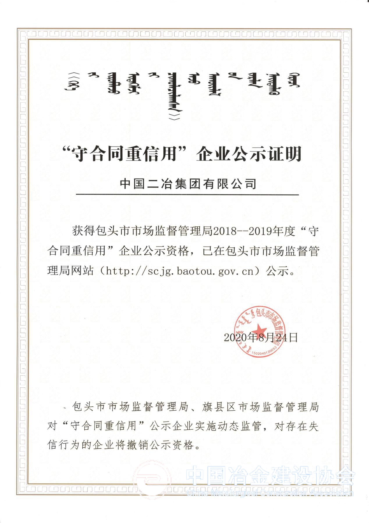 10月29日,在包头市稀土高新区市场监督管理局组织召开的“2018-2019年度守合同重信用企业”颁奖大会上,中国二冶集团被授予包头市“2018-2019年度守合同重信用企业”荣誉称号。