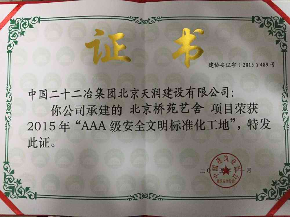 11月6日,中国二十二冶集团北京天润公司承建的北京桥苑艺舍项目获得中国建筑业协会颁发的2015年“AAA级安全文明标准化工地”称号。