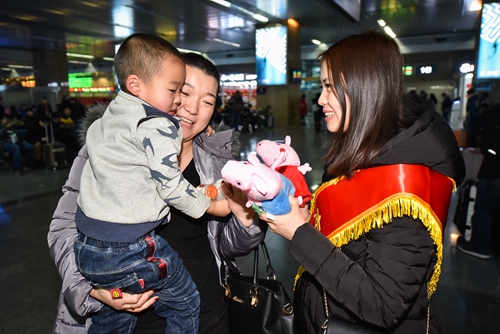 在火车站工作人员的指导下,大家很快进入了角色,“您好,候车厅往这边走”、“您的行李太多,我来帮您拿”、“大爷,我来帮您取票”、“请将身份证放在这里,看前方的摄像头”……志愿者们在取票口、进站口、候车厅各处忙碌着,有的为旅客指引路线,有的帮助来往的旅客搬运行李,有的帮老年人购票取票,有的引导旅客进站,大家在各自的“新岗位”上忙的不亦乐乎。此外,志愿者们还为候车的旅客送去了春联和福字以及新年最美好的祝愿,同时为孩子们精心准备了“小猪佩奇”暖心小礼物,让她们在候车时、归途中有玩具的陪伴。此次活动,让归途的人们收获满满的祝福和喜悦,营造出了欢乐喜庆、文明和谐的节日气氛。
