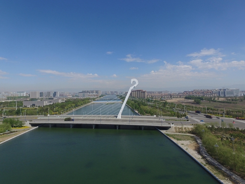 敕勒川大街跨东河桥位于内蒙古党政大楼东南角,桥梁采用钢筋混凝土现浇箱梁结构形式,总面积1.08万平方米。该桥梁在预应力混凝土连续箱梁的基础上辅以斜入云霄的马头琴钢结构景观造型,筑成了如意河上的一道亮丽风景线,也是周边地区的地标性建筑。该建筑的造型风格充分展现了内蒙古绵延悠长的草原文化和民族特色,是草原文化与建筑学的完美融合。