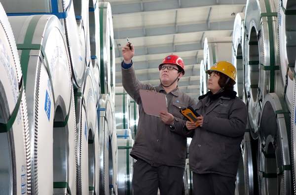 19日,河钢唐钢物流分公司高强汽车板库区职工正在检查、核实产品发货信息。