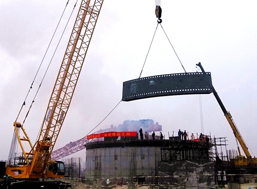 日钢精品基地一号高炉第一带炉壳开始吊装