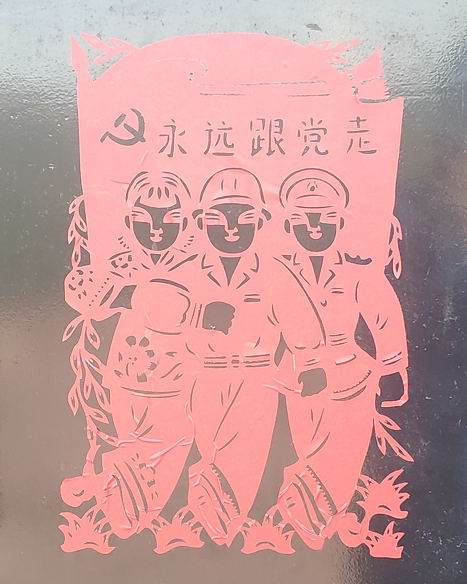 鲜红色的窗花栩栩如生:上端有一面党旗,由镰刀和斧头图案与“永远跟党走”五个字并列在党旗上方;党旗下方则是两男一女精神抖擞,迈着稳健的步伐向前走。这对窗花是鄂学强利用工作之余慢慢剪出来的,倾注了他对党的敬仰和感激之情。