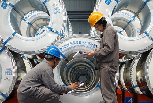 8月11日,河钢唐钢物流分公司高强汽车板库区职工正在核实产品信息、组织产品发货。