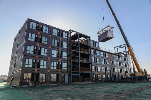 该项目一期工程由2栋5层公寓楼和1栋设备用房组成,总建筑面积9281.55平方米,由314个箱体模块组成。箱体模块之间采用专用连接件进行连接,吊装采用定制的吊具进行吊装,吊具自带手动葫芦可在起吊时对箱体模块进行平衡调整保证箱体顺利就位。此次完成箱体模块安装封顶的2#楼由157个箱体模块组成,家具家电配备齐全,楼内配有物业管理用房、超市、活动室、公共卫生间等,可容纳144户业主入住。完全满足业主生活需求。 (中冶天工集团 曹非男)