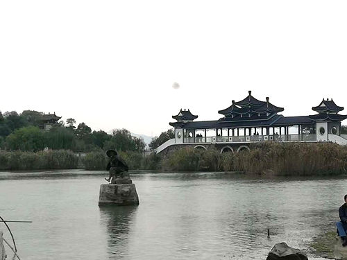 "鼋头渚"老门楼用琉璃瓦顶建造,正面是"鼋头渚"三个鎏金大字;背面则书写着"山辉川媚"。鼋头渚是太湖最美的一角。到鼋头渚乘必坐太湖渡轮去太湖仙岛,双层的渡轮很大,航行的十分平稳。上到渡轮顶层,一群退休结伴而来的游人正在引吭高歌《我的祖国》,引得人们驻足拍照并与之齐唱。渡轮在湖面上行驶之时,天空中细雨如丝,倚栏远眺,湖水在微风中荡涤起层层柔波,远处的山峦,好似披着曼妙的轻纱。极目远眺,骤然感觉尘世的烦恼在山水之间荡然无存,天地辽阔,人生无限美好。思绪不由得飞转,想起了几首描写江南古韵的诗,“江南好,风景旧曾谙;日出江花红胜火,春来江水绿如蓝。能不忆江南?那个对江南情有独钟的唐代现实主义大诗人白居易所描写的那一花,一春,一水,不仅为我们勾勒出一副色彩明快的画卷,而且让人充满了想象空间。而唐朝花间派词人韦庄笔下的江南则另有一番意境:“人人尽说江南好,游人只合江南老。春水碧于天,画船听雨眠。垆边人似月,皓腕凝霜雪。未老莫还乡,还乡须断肠。”江南,着实让人流连忘返,着实让人情深义重。