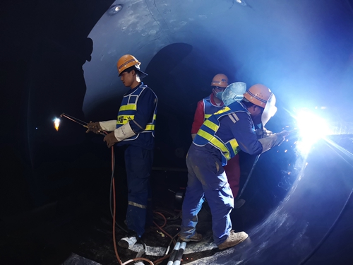 11月30日,工人正在进行8号井管道注浆孔接头焊接施工。由中国一冶承建的湖北省鄂州市三山湖至洋澜湖生态补水工程,将实现三山湖与洋澜湖的水体置换,使鄂州城中湖——洋澜湖水质达到Ⅲ类标准。目前,工程建设中的泵站已完成施工,3300米的顶管施工进入冲刺阶段。 中国一冶集团 陈 明 摄影报道