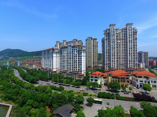 5月12日,无人机俯瞰湖北黄石市磁湖岸边中冶•黄石公园楼盘。